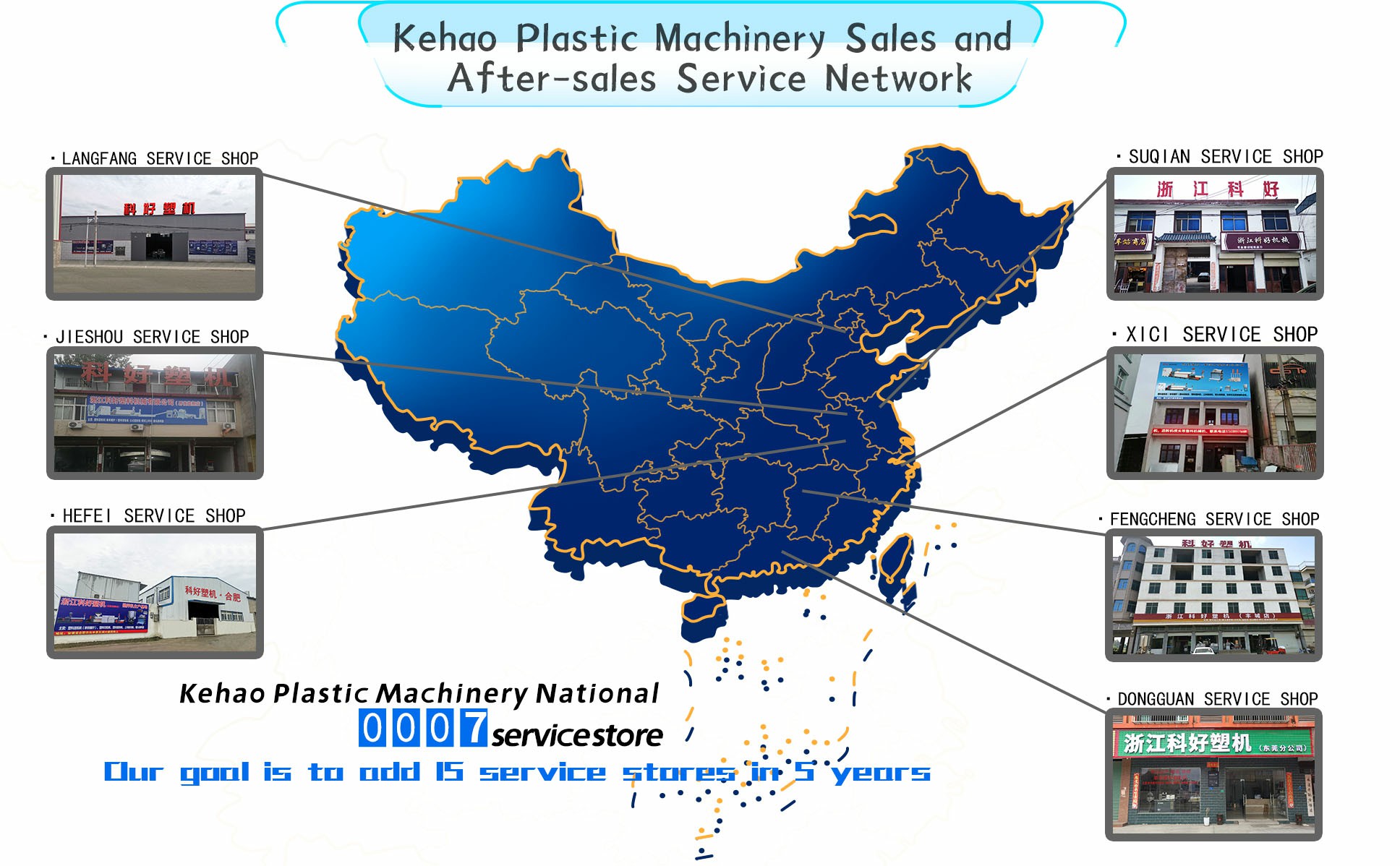 Kehao Plastic Machinery has successively established 7 service stores nationwide, including Zhejiang Cixi Store, Jiangsu Suqian Store, Jiangxi Fengcheng Store, Anhui Jieshou Store, Guangdong Dongguan Store, Anhui Hefei Store, and Hebei Langfang Store.